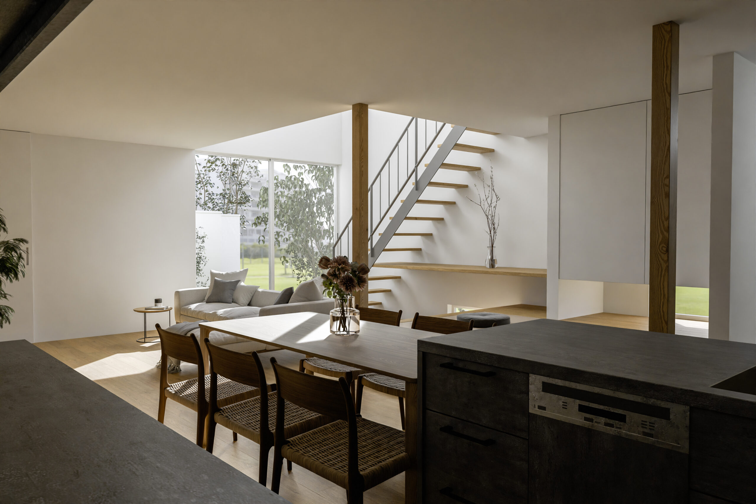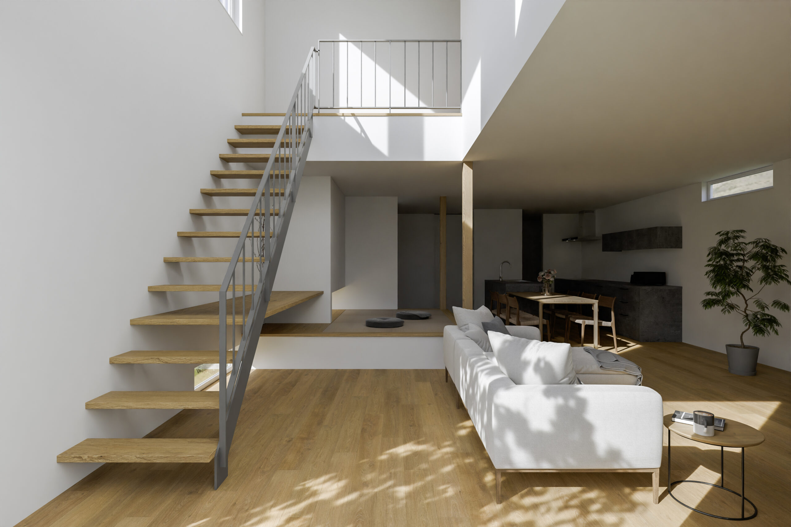 2階の部屋へつながるリビング階段。奥行を感じられるダイニングリビング。日々の暮らしに季節の変化や癒し、そして家族とのつながりをもたらします。