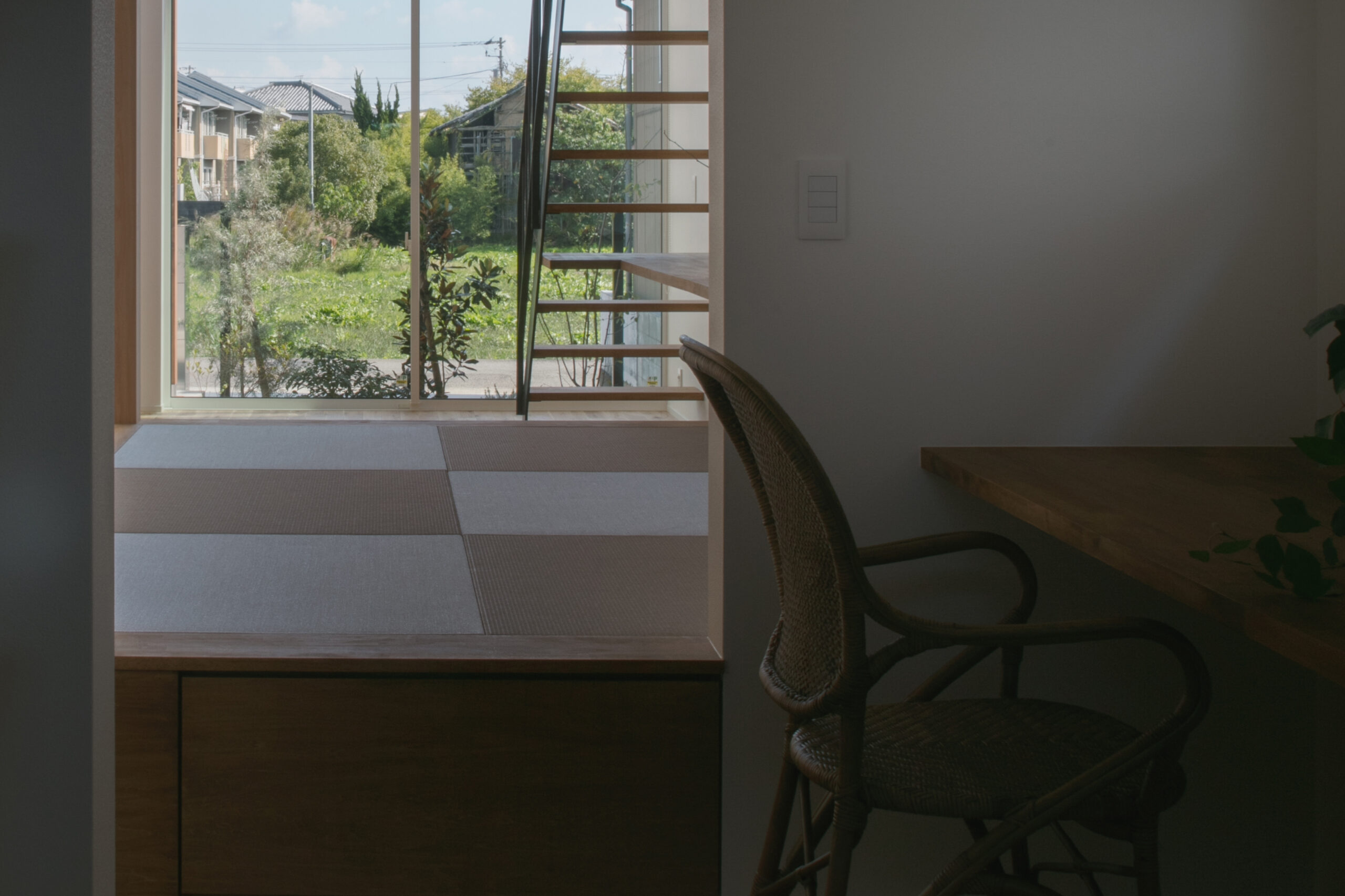 視線を気にせず穏やかに過ごせる住まい。大きな窓とほどよく囲まれた壁が空間に奥行きを生み、室内と屋外の境界をやわらかくつなげています。